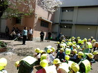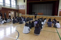 1年生は初めて行う下校班。班に分かれて下校する前に教師の話を聞いています。